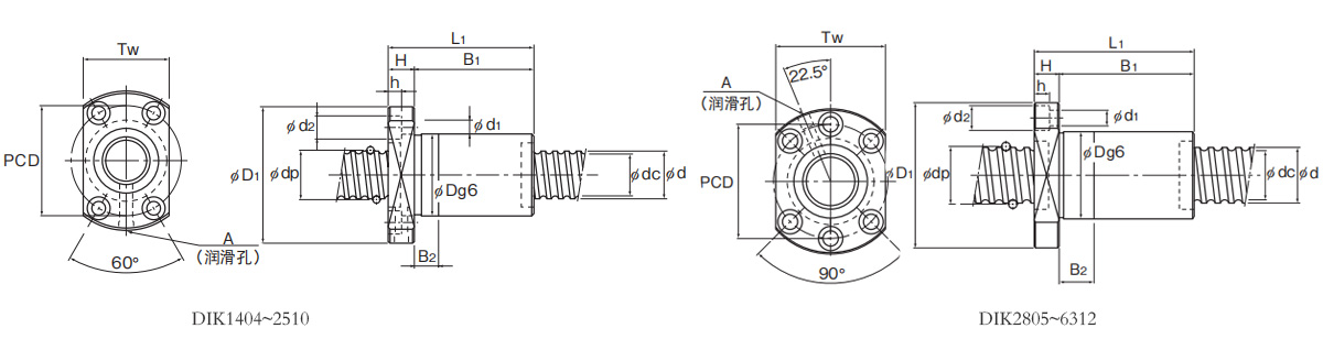 | 丝杆型号 | 轴径 | 导程 | 珠经 | 沟槽谷经 | 珠卷数 | 动负荷 | 静负荷 | 容许载荷 | 刚性 | 螺母外径 | 法兰直径D1 | 法兰直径D2 | 全长L1 | 法兰厚度 | 螺母宽度B1 | 螺母宽度B2 | 螺母宽度B3 | 螺栓圆周直径 | 螺栓尺寸 | 螺母类型 | 法兰宽度 | 螺栓尺寸N1 | 润滑孔 | 丝杆轴的惯性力矩 | 螺母重量 | 丝杆重量 | *大转速 |